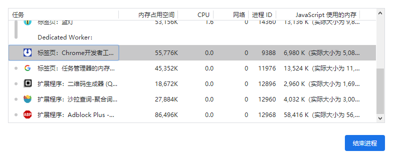 浏览器开发者工具中,可以找到任务管理器这一工具,打开是这样的界面:
