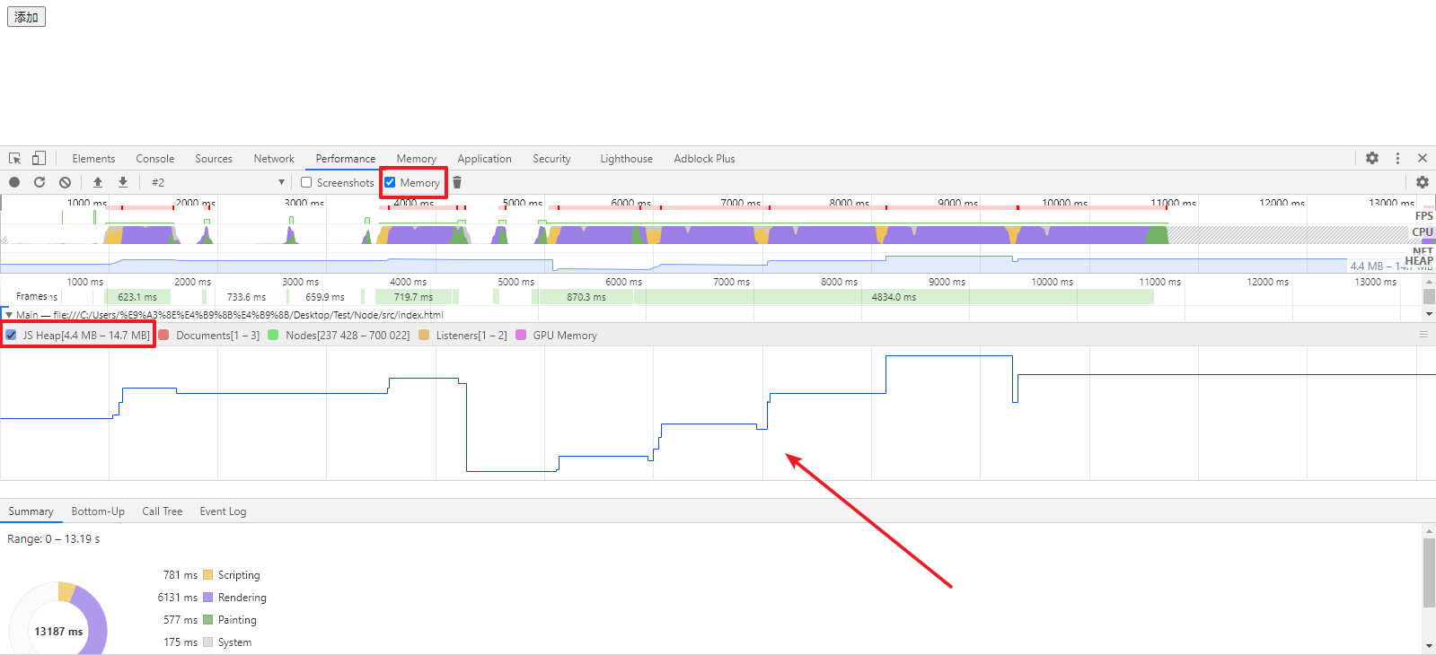 我们打开网页并点击录制按钮,然后正常点击界面的添加按钮,让内存开始变化,测试完成后停止录制就得到下面的时序图:(我们只需要勾选需要展示的内容,让界面更简洁):