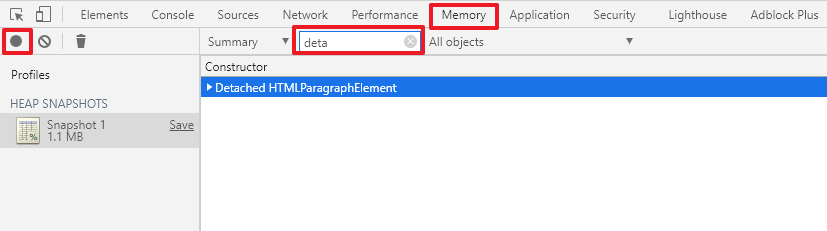 我们打开工具栏的内存选项卡,再点击左侧的录制按钮即可拍下当前堆内存快照: